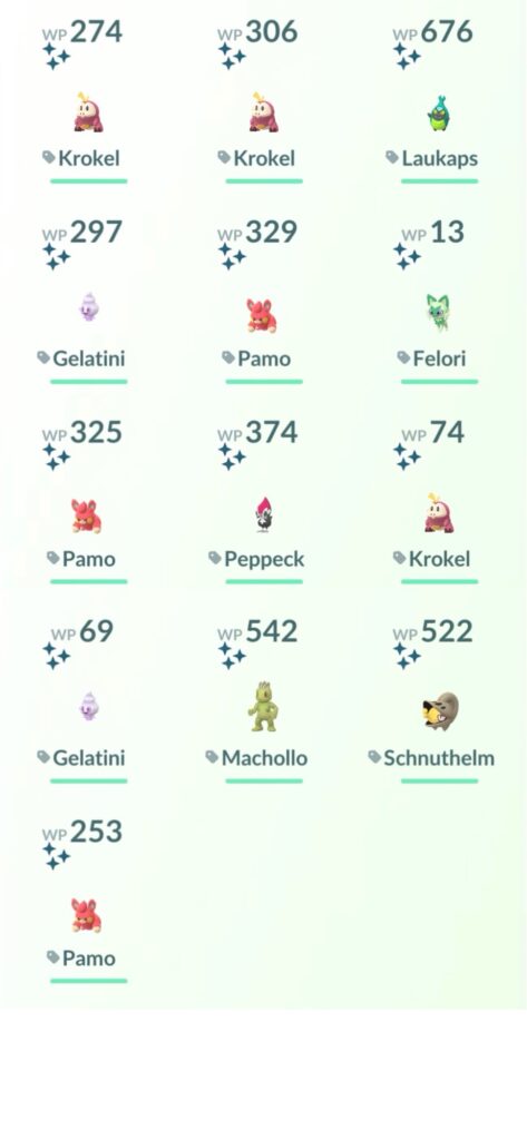 13 Shinys zu fangen. Die einzigen über die ich mich gefreut habe, waren Pamo. Jetzt kann ich da die Familie voll machen. Den Rest hatte ich bereits mehrfach.