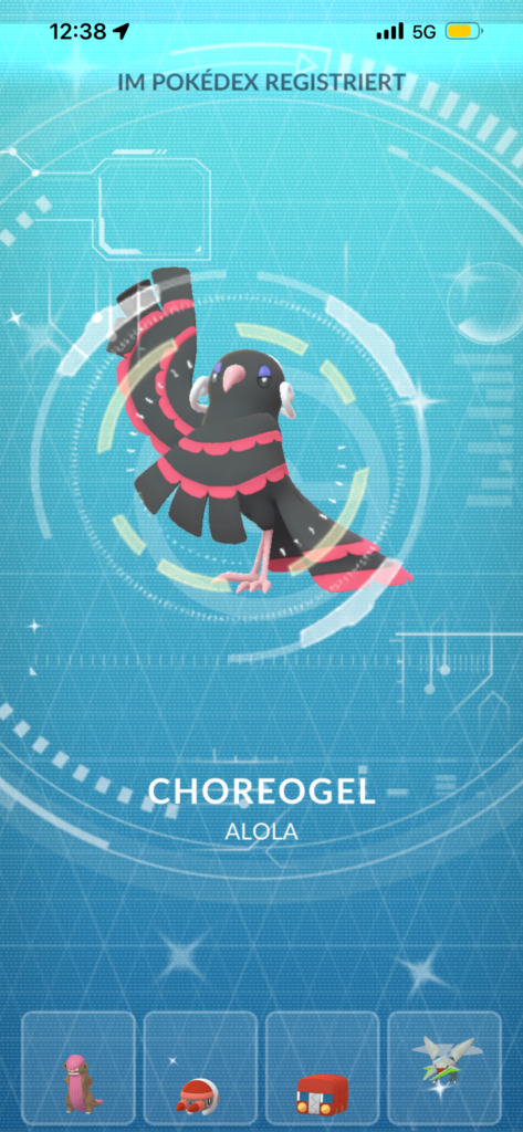 Erst auf Seite 7 der befristeten Forschung gab es ein schillernden Encounter. Damit war das Tagesziel für mich schon abgeschlossen. Auf einer längeren Autofahrt wurde dann noch der Go++ angeworfen, da konnte noch ein Shiny Choreogel gefangen werden.